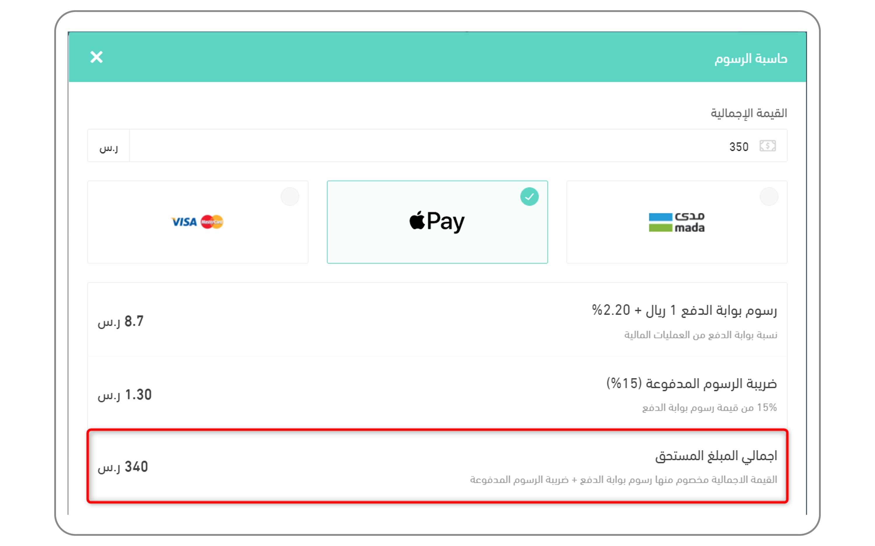 * ابل باي ، فيزا: 1 ريال + 2.20% + ضريبة رسوم الدفع 15%